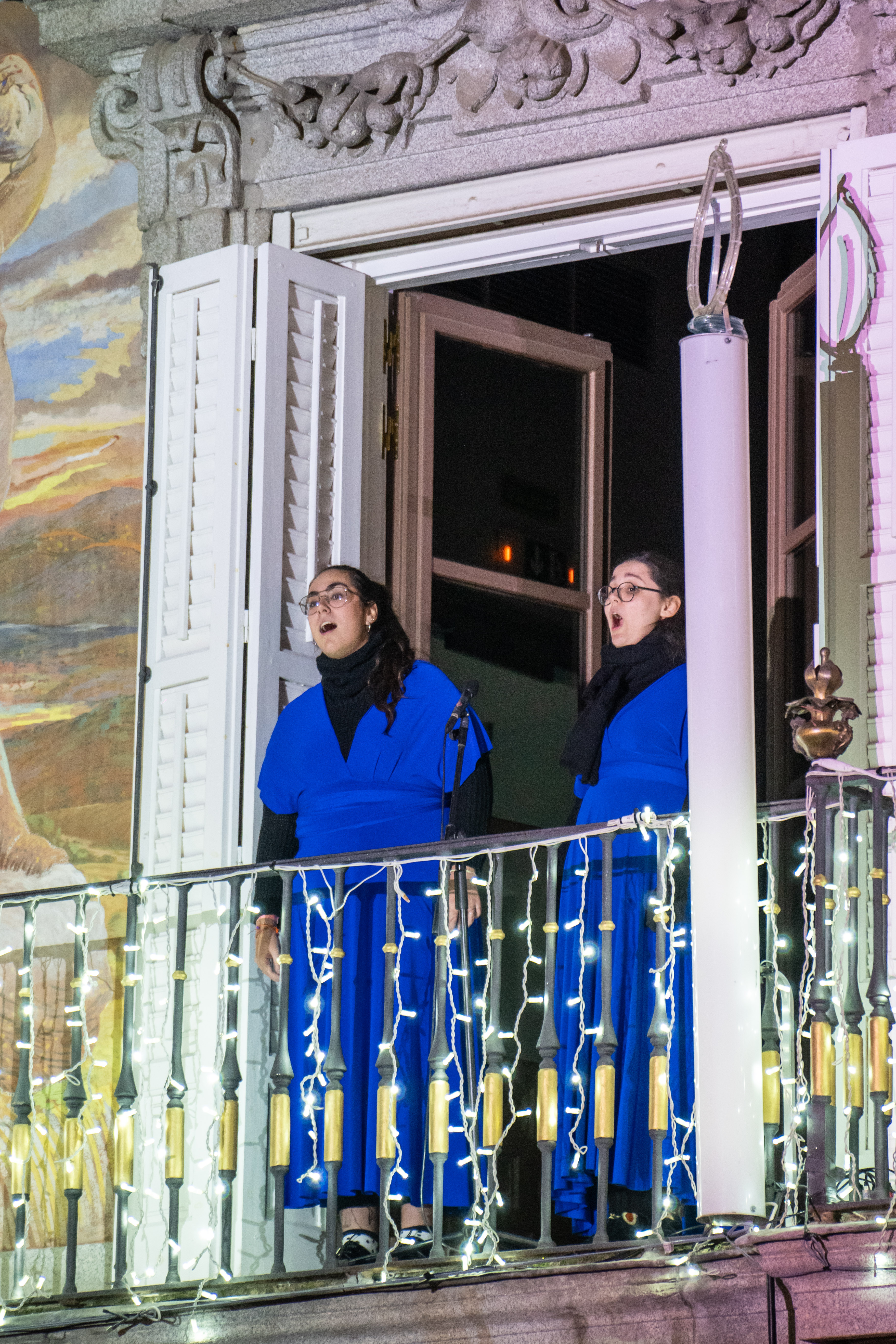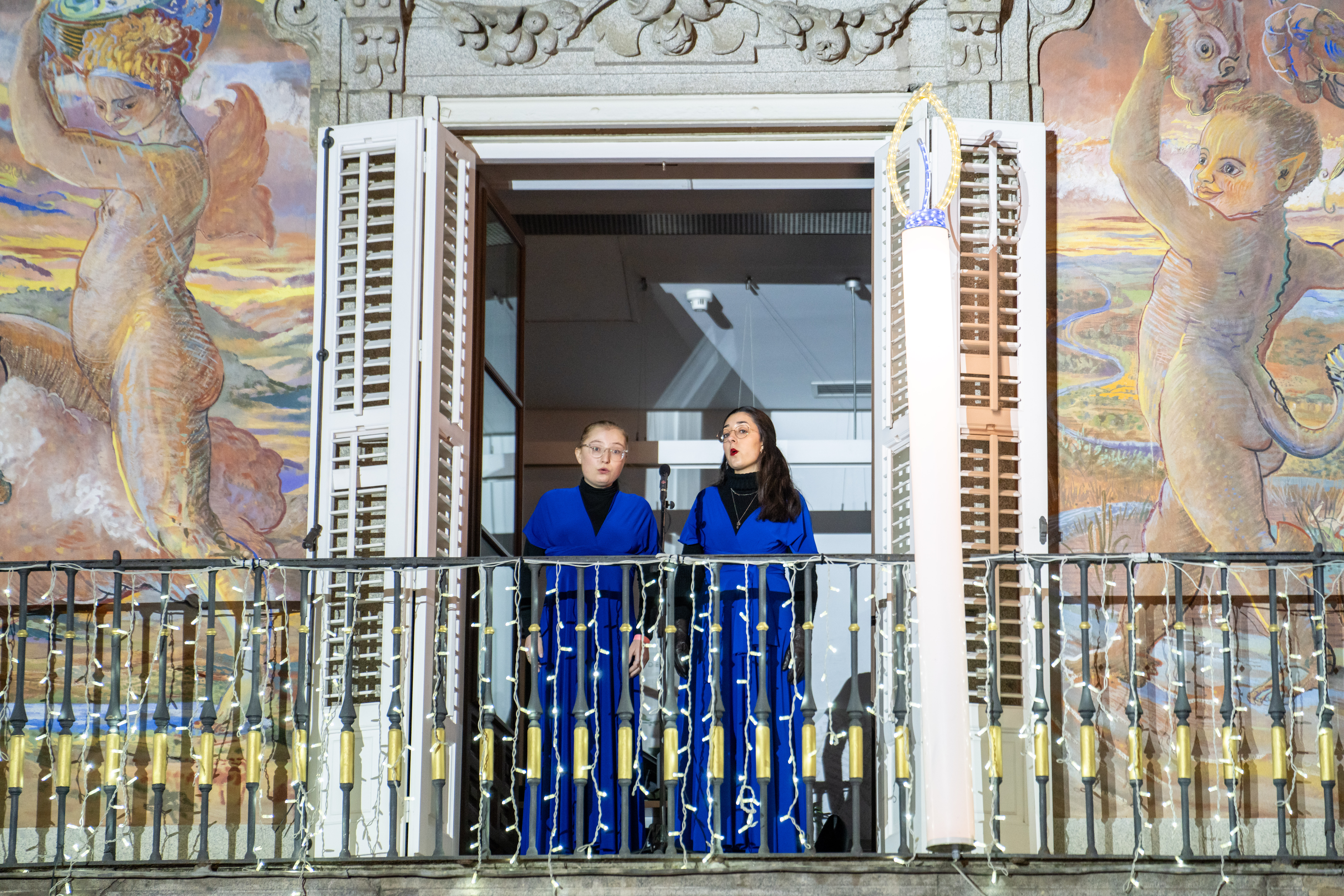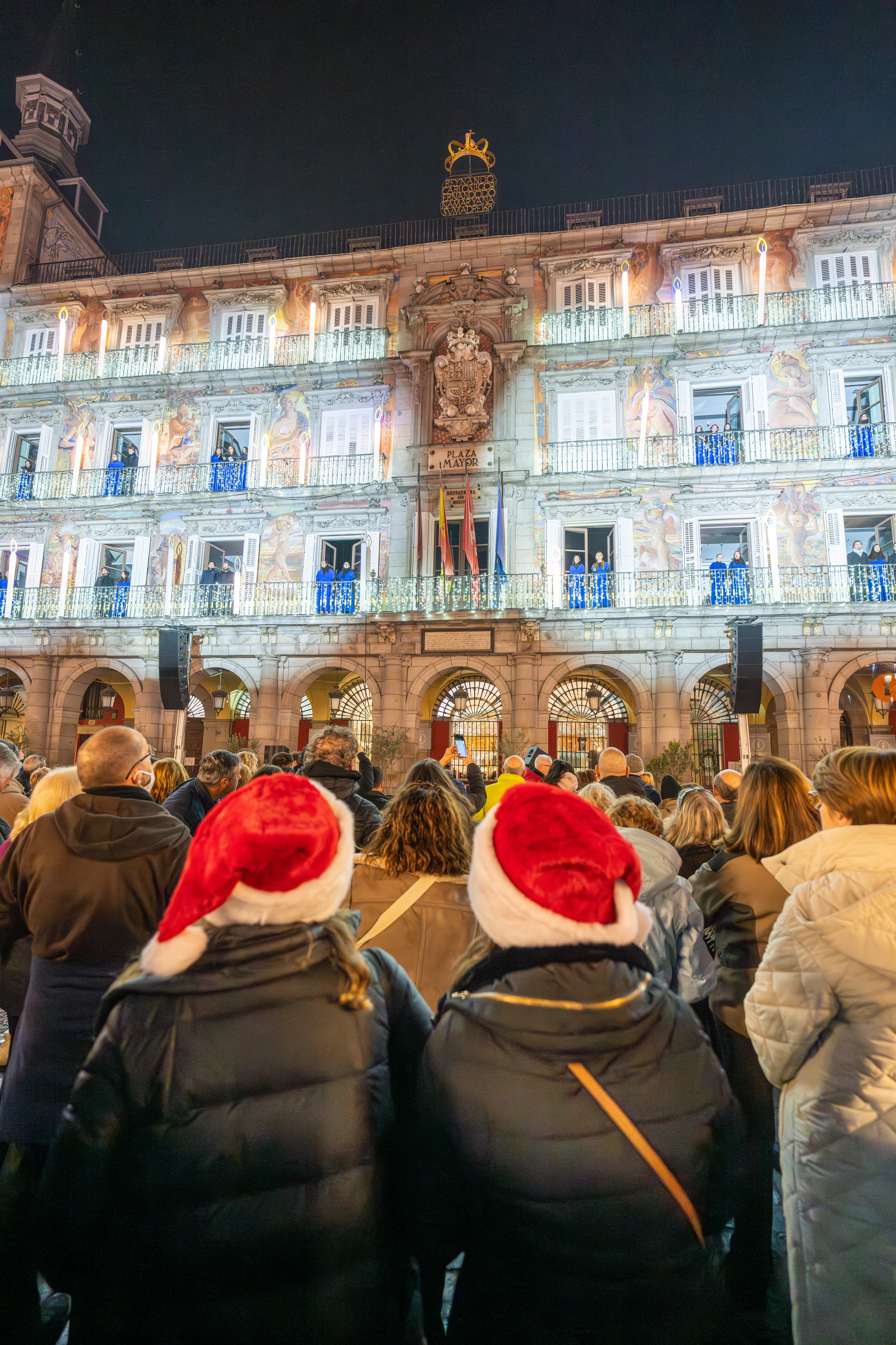Imágenes del Coro de Jóvenes de Madrid en los balcones de la Casa de la Panadería, en la Plaza Mayor, dando inicio a la programación musical de esta Navidad. En sus diez años de historia, el Coro ha cantado en los más importantes festivales de Europa y ha recibido diversos premios.